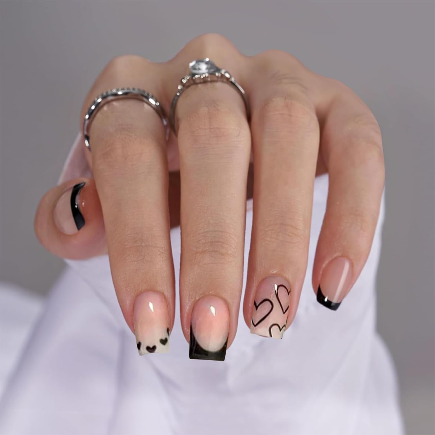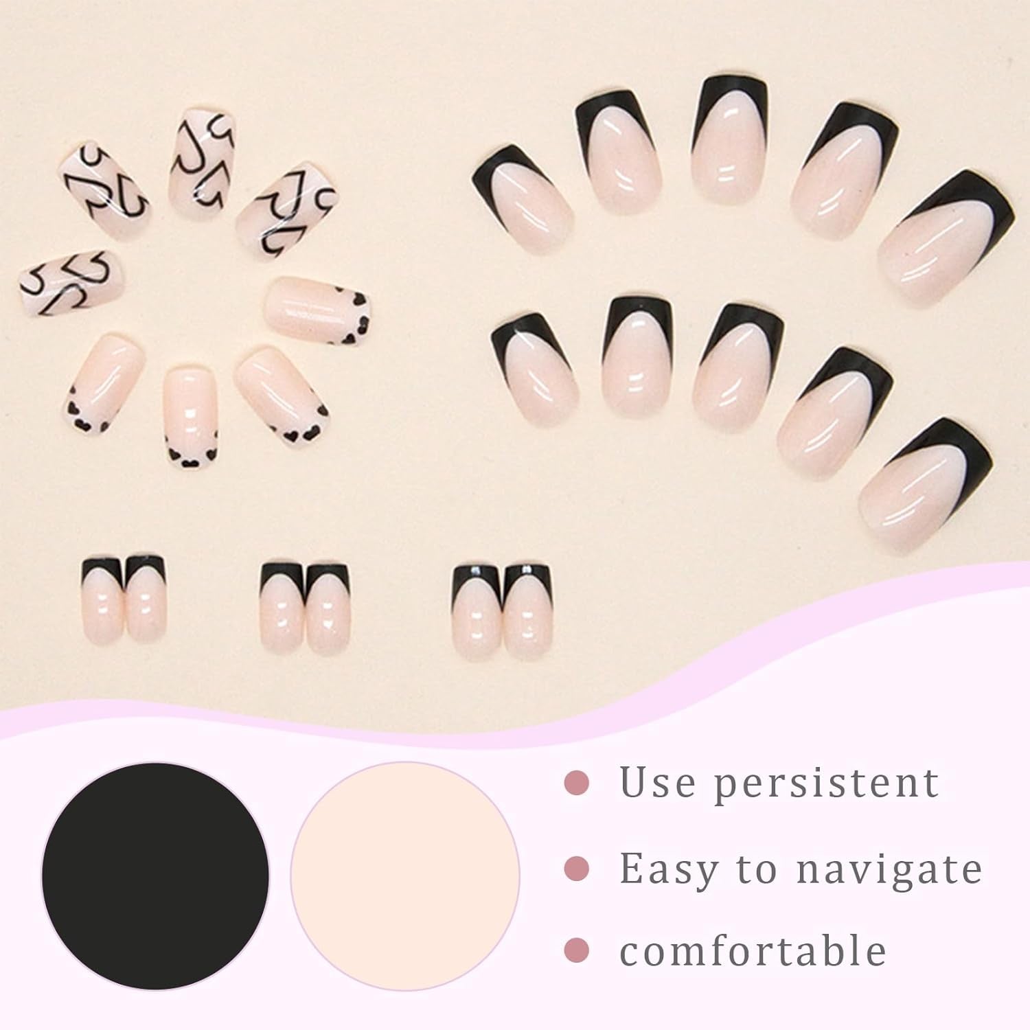24 szt. Krótkie kwadratowe francuskie końcówki fałszywe paznokcie biały wzór serca czarne paznokcie akrylowe pełna pokrywa