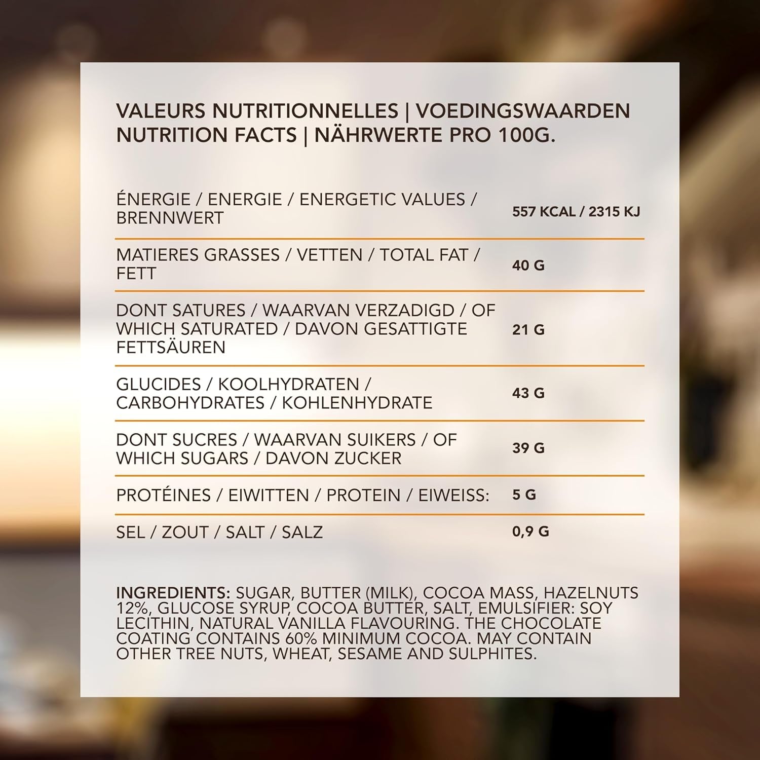 Cukier, masło (mleko), miazga kakaowa, orzechy laskowe 12%, syrop glukozowy, masło kakaowe, sól, emulgator: lecytyna sojowa, naturalny aromat waniliowy. Powłoka czekoladowa zawiera co najmniej 60% kakao. Może zawierać inne orzechy, gluten, sezam i siarczyny
