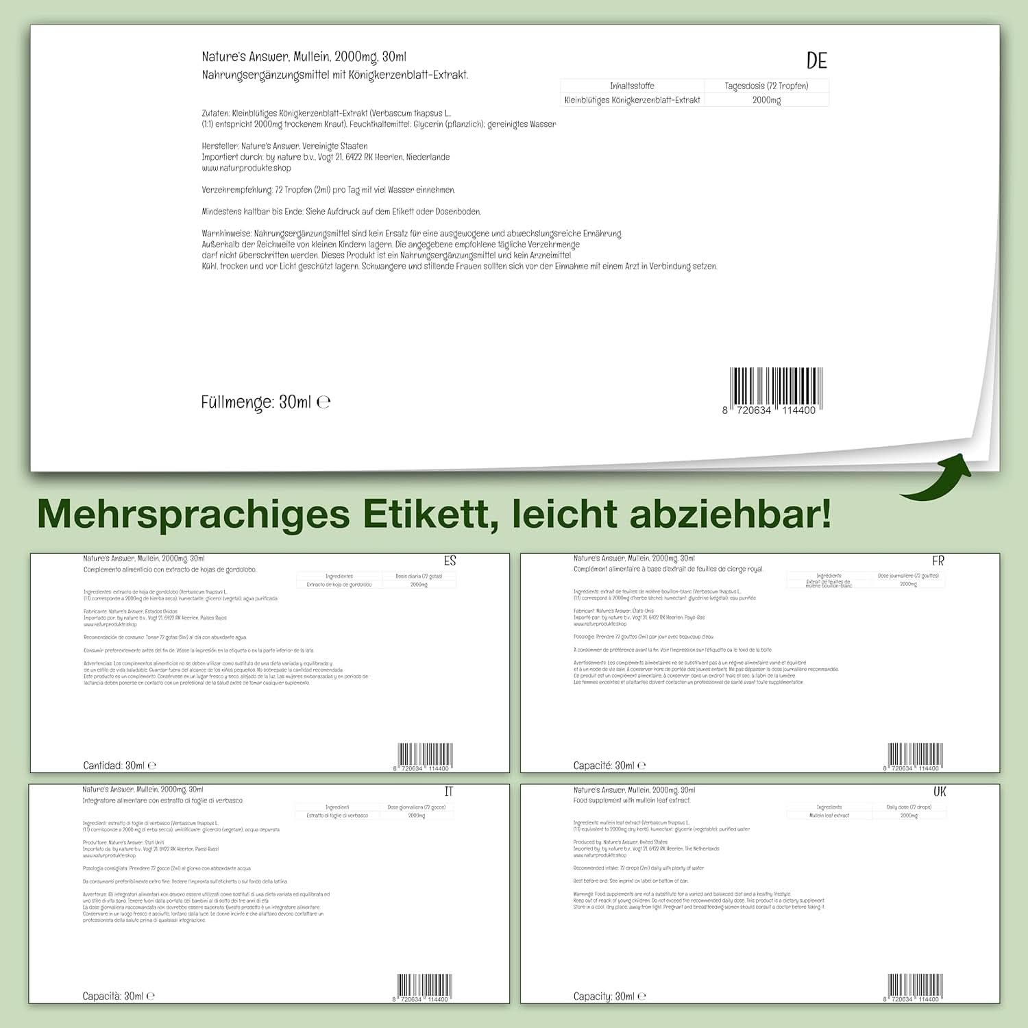 - SKONCENTROWANA DAWKA: 72-kroplowa dawka ekstraktu dziewanny Nature's Answer zawiera 2000 mg ekstraktu z liści dziewanny, który można przyjmować codziennie do organizmu