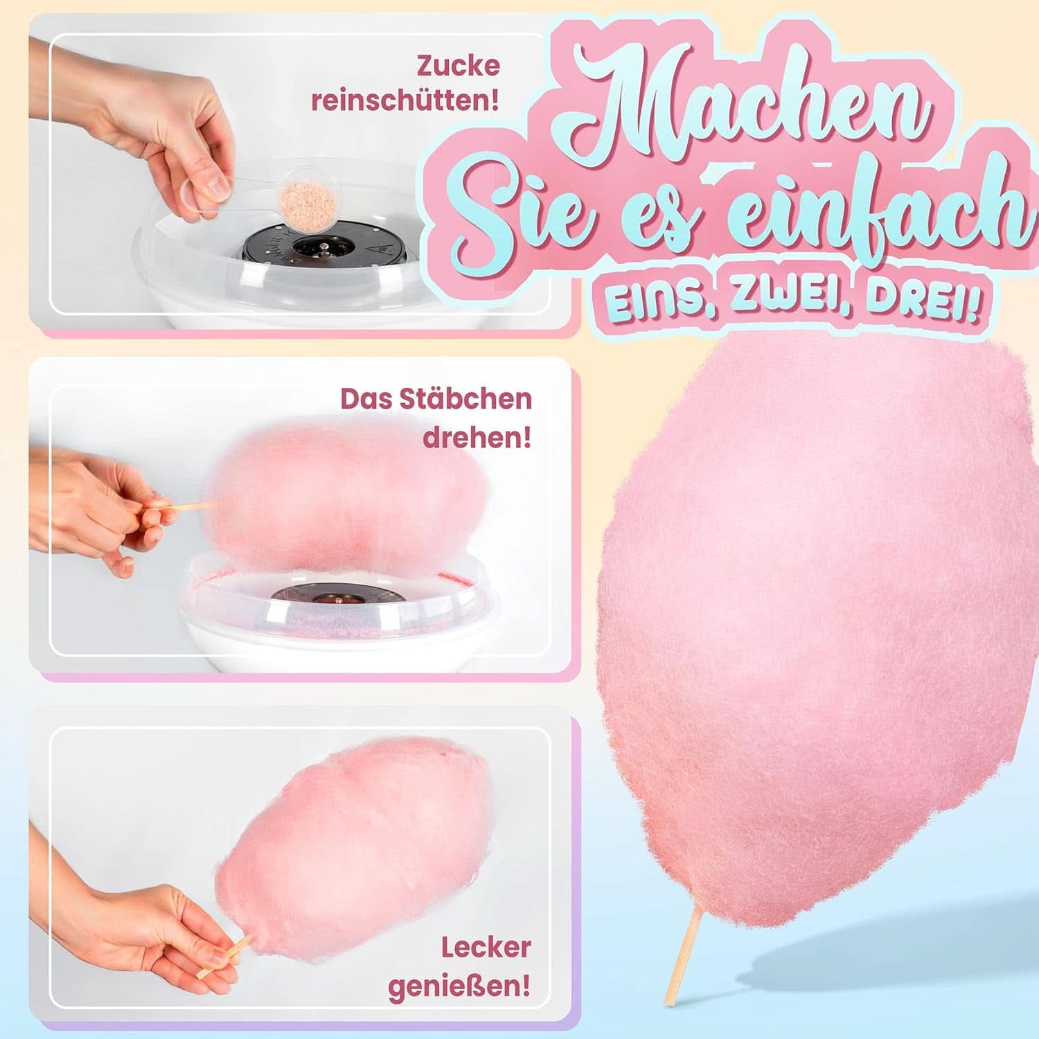 Ten zestaw waty cukrowej zawiera 50 drewnianych patyczków wielokrotnego użytku. Cukier współpracuje ze wszystkimi maszynami do waty cukrowej (zarówno profesjonalnymi, jak i domowymi) i pozwala na wykonanie kolorowych słodkości, które zachwycą zarówno małych, jak i starszych.