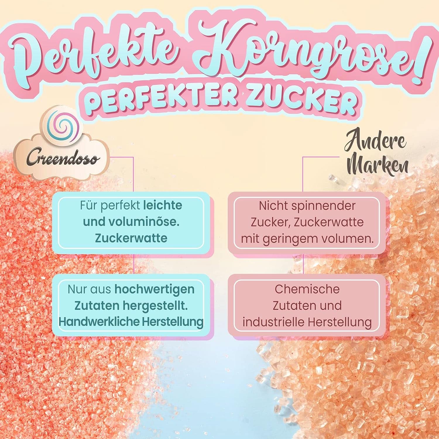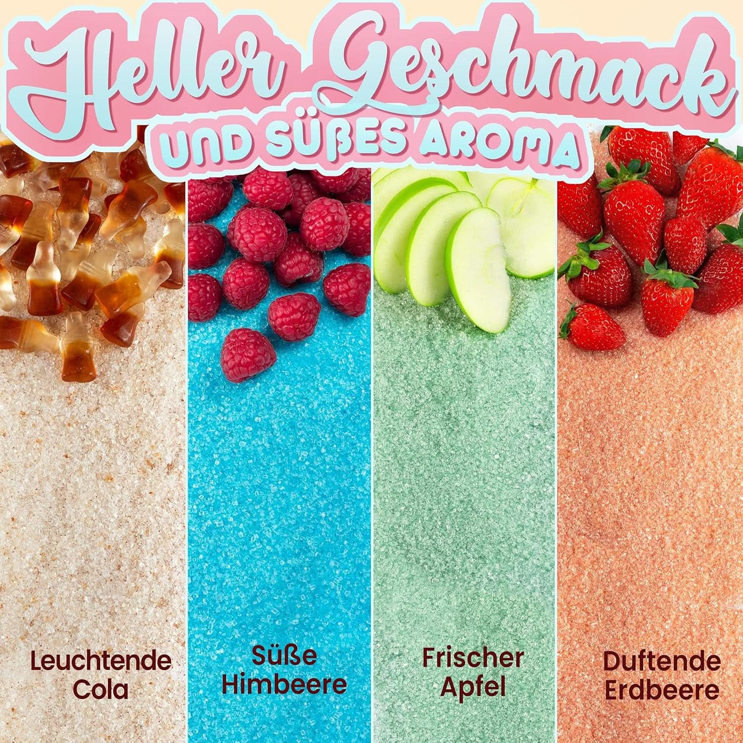 GREENDOSO® Wata cukrowa do maszyny do waty cukrowej (4 x 320 g) - 4 smaki (truskawka/cola/malina/jabłko) + 50 patyczków