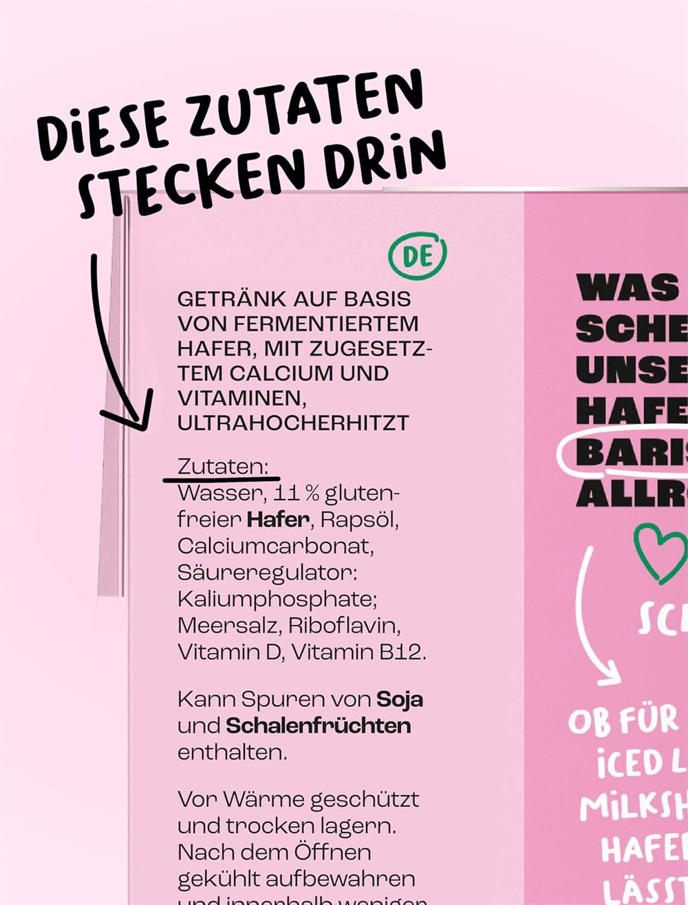 Hafer Barista Drink to wegański napój na bazie owsa, stworzony specjalnie w celu uzyskania kremowej piany w Twojej kawie — niezależnie od tego, czy przygotowujesz cappuccino, latte, flat white, kawę mrożoną czy koktajl mleczny. Idealny zarówno dla profesjonalistów-smakoszy, jak i entuzjastów kawy w domu, oferuje wysokiej jakości konsystencję o delikatnym smaku, nie zawiera produktów mlecznych ani dodatku cukru.