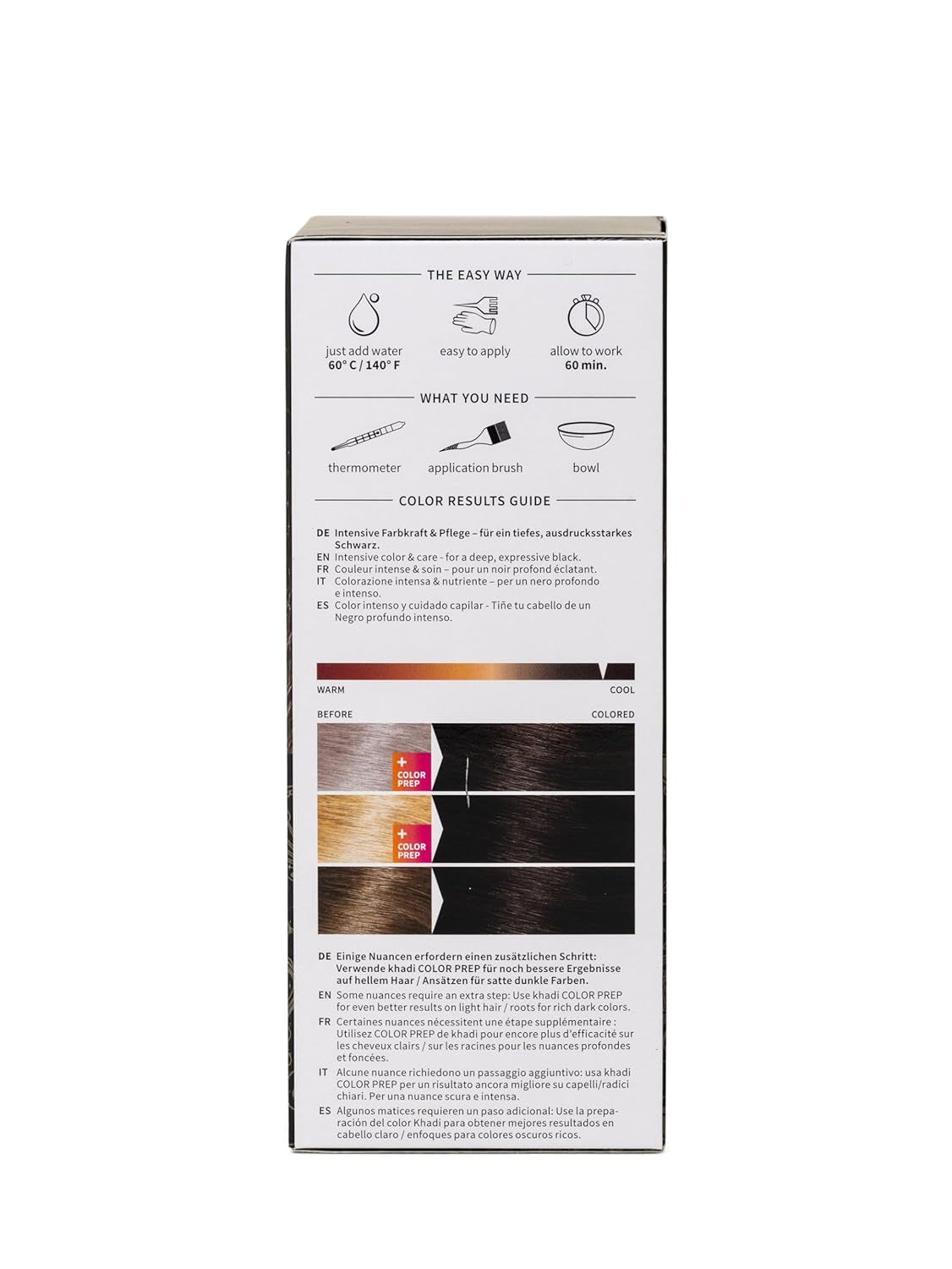 Khadi Black jest idealny do trwałej koloryzacji włosów i naturalnie przywraca im zdrową witalność. Indywidualny efekt zależy od naturalnego koloru włosów.