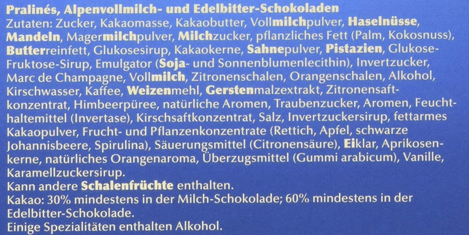 Składniki: cukier, miazga kakaowa, tłuszcz kakaowy, pełne MLEKO w proszku, ORZECHY LASKOWE, MIGDAŁY, odtłuszczone MLEKO w proszku, cukier mleczny, tłuszcz roślinny (palmowy, kokosowy), syrop glukozowy, tłuszcz maślany, jądra kakaowe, śmietanka w proszku, glukoza-fruktoza, pistacje, syrop, emulgator (lecytyna słoneczna sojowa i kwiatowa), cukier inwertowany, Marc de Champagne, MLEKO zagęszczone, skórka cytryny, skórka pomarańczowa, alkohol, kirsch, kawa, mąka pszenna, ekstrakt słodowy JĘCZMIENNY, koncentrat soku cytrynowego, przecier malinowy, naturalne aromaty, glukoza, aromaty, substancja utrzymująca wilgoć (inwertaza), koncentrat soku wiśniowego, sól, syrop cukru inwertowanego, odtłuszczone kakao w proszku, regulator kwasowości (kwas cytrynowy), białko jaja, substancja glazurująca (guma arabska), naturalny aromat pomarańczowy, pestki moreli, koncentraty owocowe i roślinne (rzodkiewka, jabłko, czarna porzeczka, spirulina), syrop cukrowy karmelowy, wanilia. Może zawierać inne orzechy.