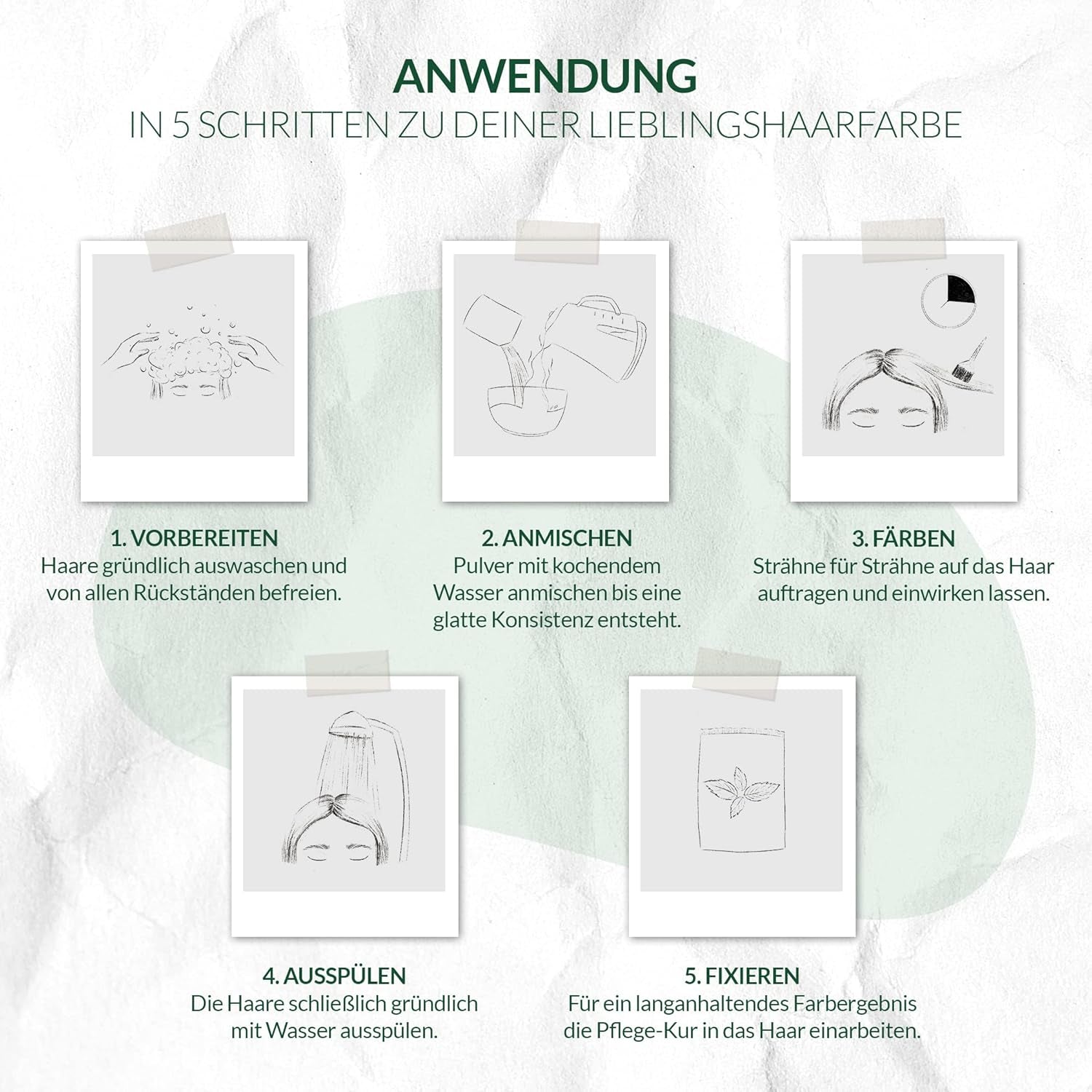 - Aplikacja wyłącznie na nieuszkodzoną skórę: Zmieszać kolor z wrzącą wodą, unikać wdychania pyłu proszku, zmieniając czas aplikacji w zależności od odcienia w zakresie od 15 min. i 2 godz