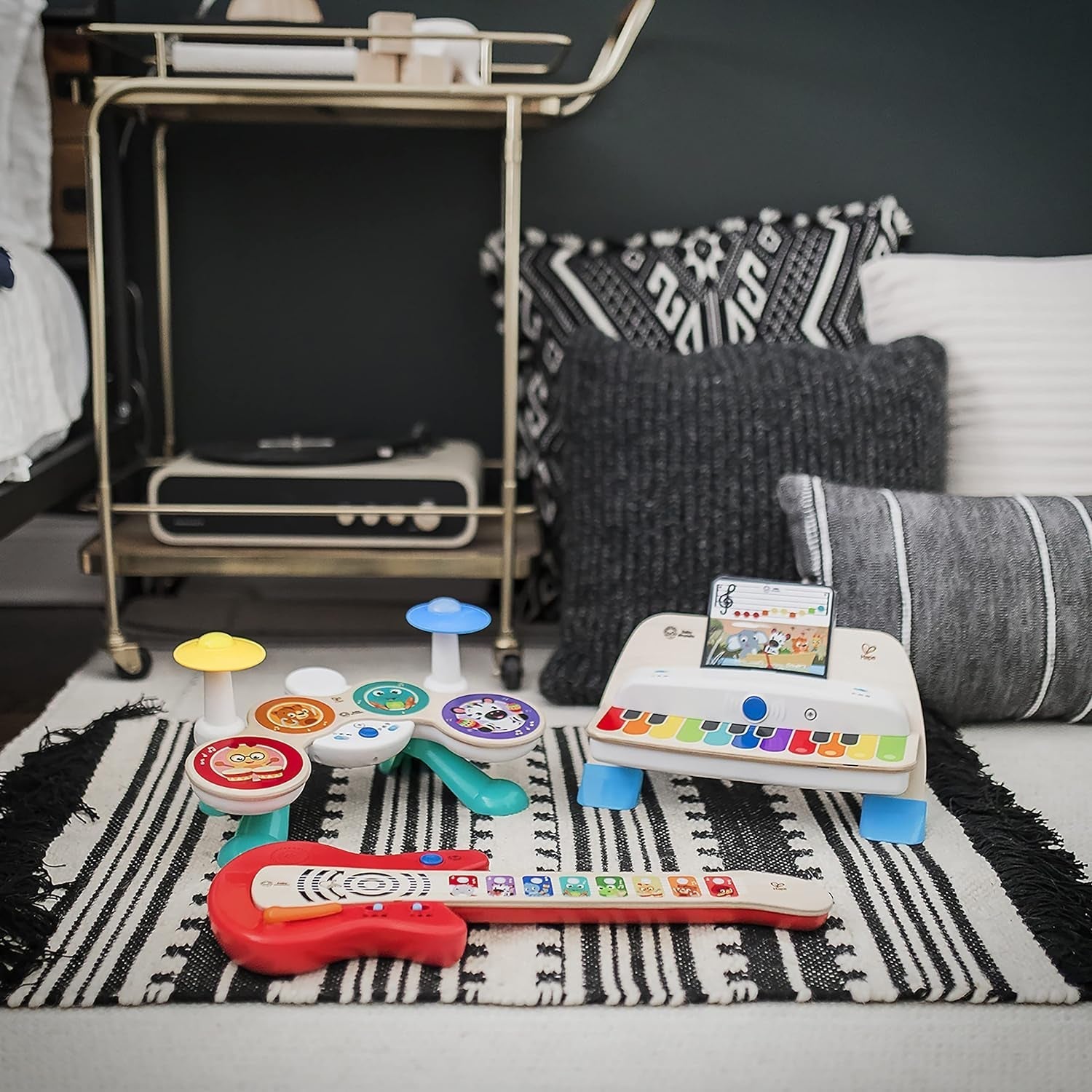 - Bezpieczna i łatwa w czyszczeniu konstrukcja, razem dostrojone instrumenty łączą się łatwo, bezpiecznie i bezprzewodowo za pomocą sygnałów radiowych. Drewniana konstrukcja bez pokręteł sprawia, że ten zestaw perkusyjny jest szczególnie łatwy do czyszczenia. Odpowiedni dla dzieci w wieku 12 miesięcy i starszych