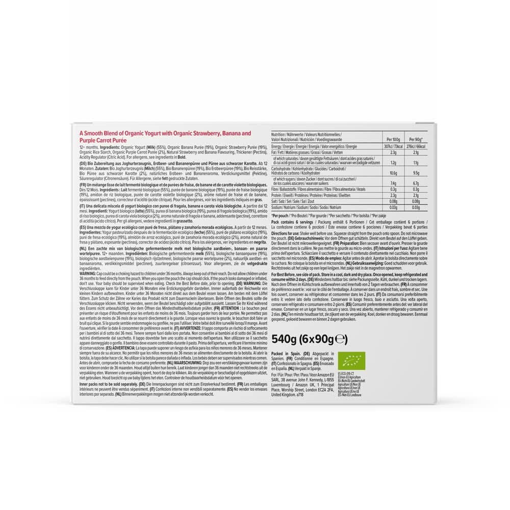 Organiczny jogurt (MLEKO) (55%), organiczny przecier bananowy (19%), organiczny przecier truskawkowy (19%), ekologiczna skrobia ryżowa, organiczny przecier z czarnej marchwi (2%), naturalny aromat truskawkowy i bananowy, substancja zagęszczająca (pektyna), regulator kwasowości (kwas cytrynowy).