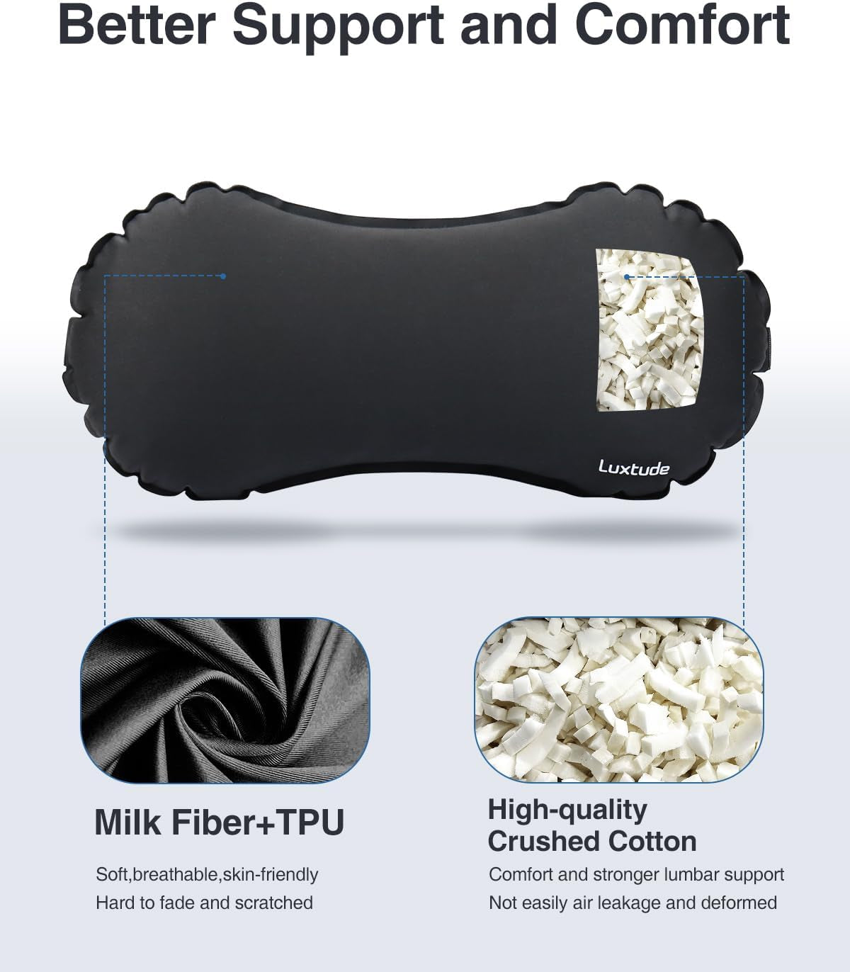 • „Miękkie i mocniejsze wsparcie”: Poduszka podparcia lędźwiowego wykonana jest z włókna mlecznego, które jest wygodniejsze, miękkie i przyjazne dla skóry, oddychające i niełatwe do zmarszczek. Wewnątrz znajduje się wysokiej jakości kruszona bawełna z pamięcią kształtu jako wypełnienie. Napompowany rozmiar do 40x18x12 cm zapewnia szersze i mocniejsze podparcie lędźwiowe niż inne.