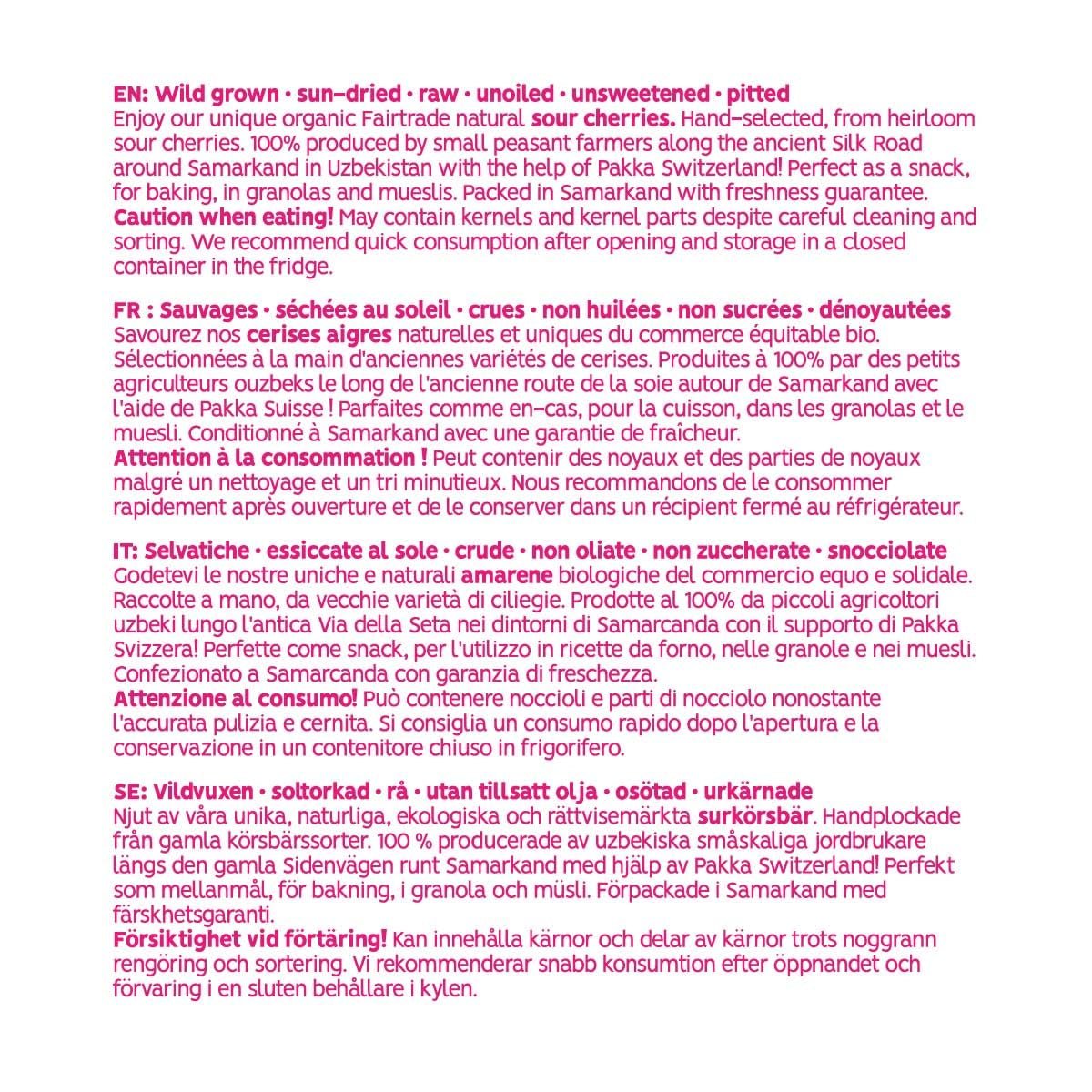 - âś... 2/2 JAKOŚĆ: Nasze wiśnie są całkowicie naturalne, minimalnie przetworzone, zrównoważone, czyste, naturalne, niesolone, bezolejowe i wolne od siarki. Pakiet smakowy Pakka gwarantuje najwyższe doznania smakowe. Świeże, ekologiczne opakowanie, które oszczędza miejsce! UWAGA UWAGA: Pomimo dokładnej kontroli mogą w nim znajdować się nasiona i części rdzenia! Prosimy o ostrożność przy jedzeniu!