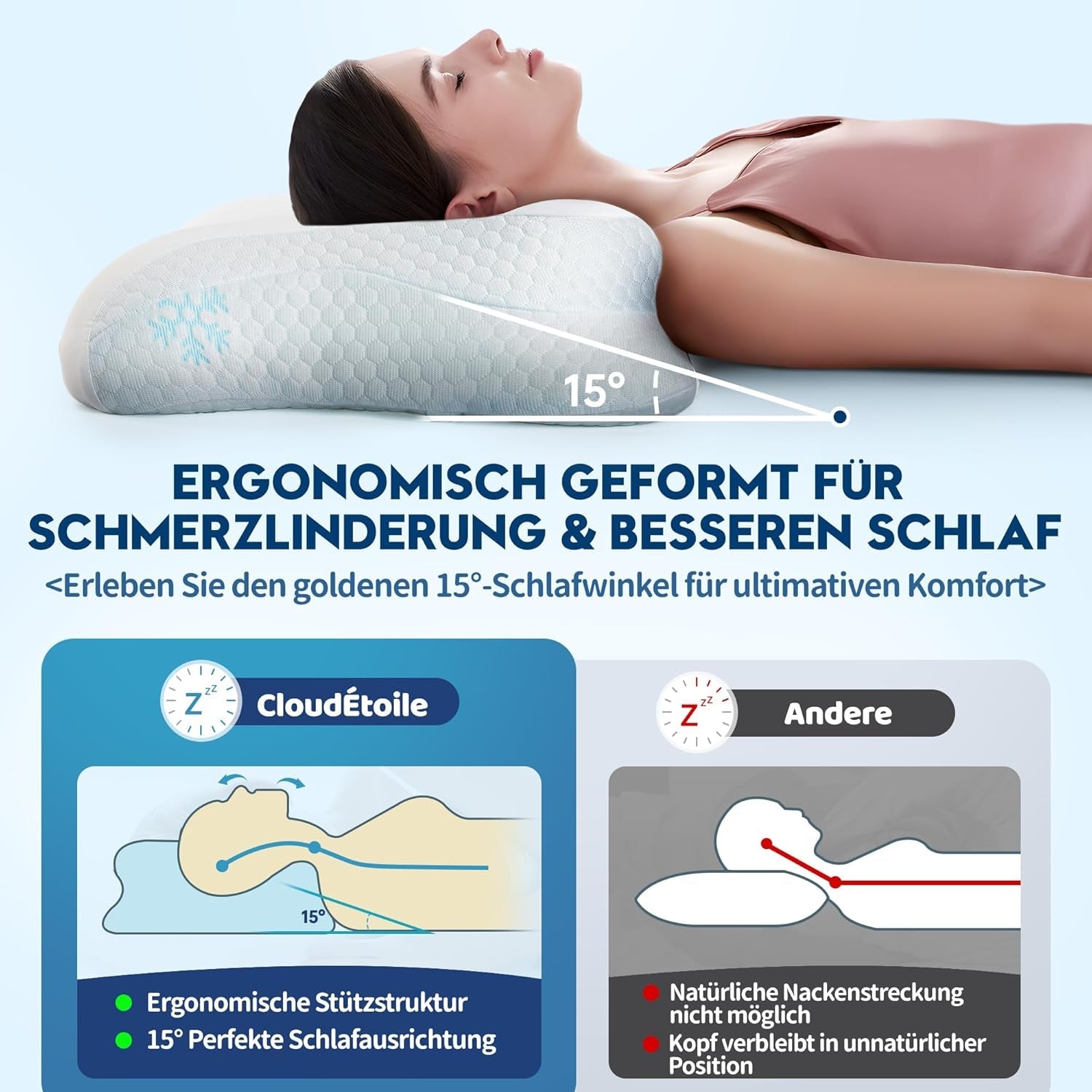 - Ergonomiczna poduszka formowana z pamięcią kształtu 2 w 1. Z 5 anatomicznymi strefami podparcia, które odtwarzają naturalne kontury ciała (testowane z 93% satysfakcji). Łagodzi ból szyi poprzez ukierunkowane wyrównywanie ciśnienia i dostosowuje się do wszystkich pozycji podczas snu. Szczególnie odpowiedni dla osób śpiących na boku - przekonujący komfort!
