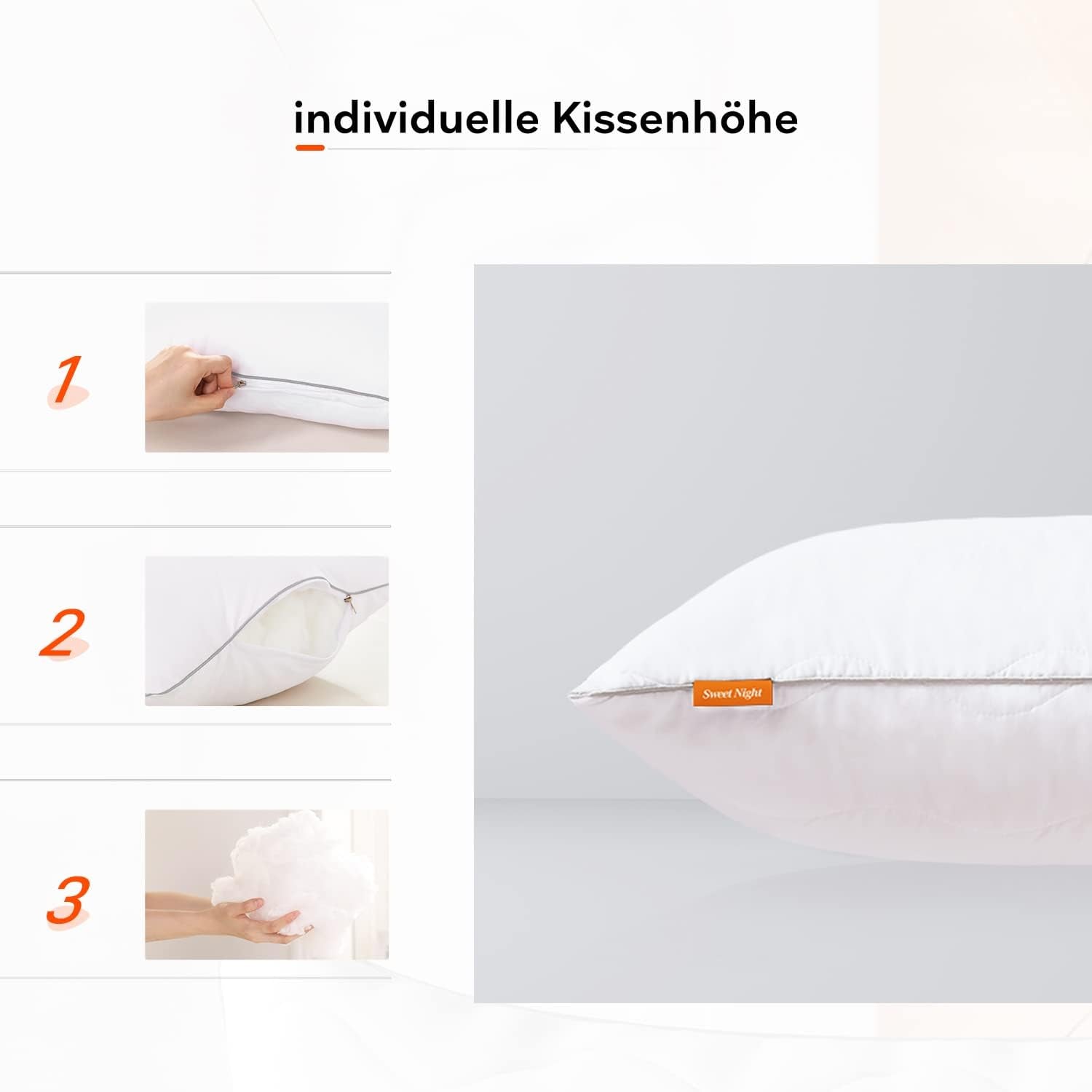 Poduszka Sweetnight wypełniona sprawdzonym poliestrem, silikonowanym klimatycznym włóknem pustym, nie powoduje grudek nawet po wielokrotnym praniu. Wysokiej jakości włókno zapewnia przyjemne uczucie miękkiego snu i zapewnia doskonałą elastyczność.