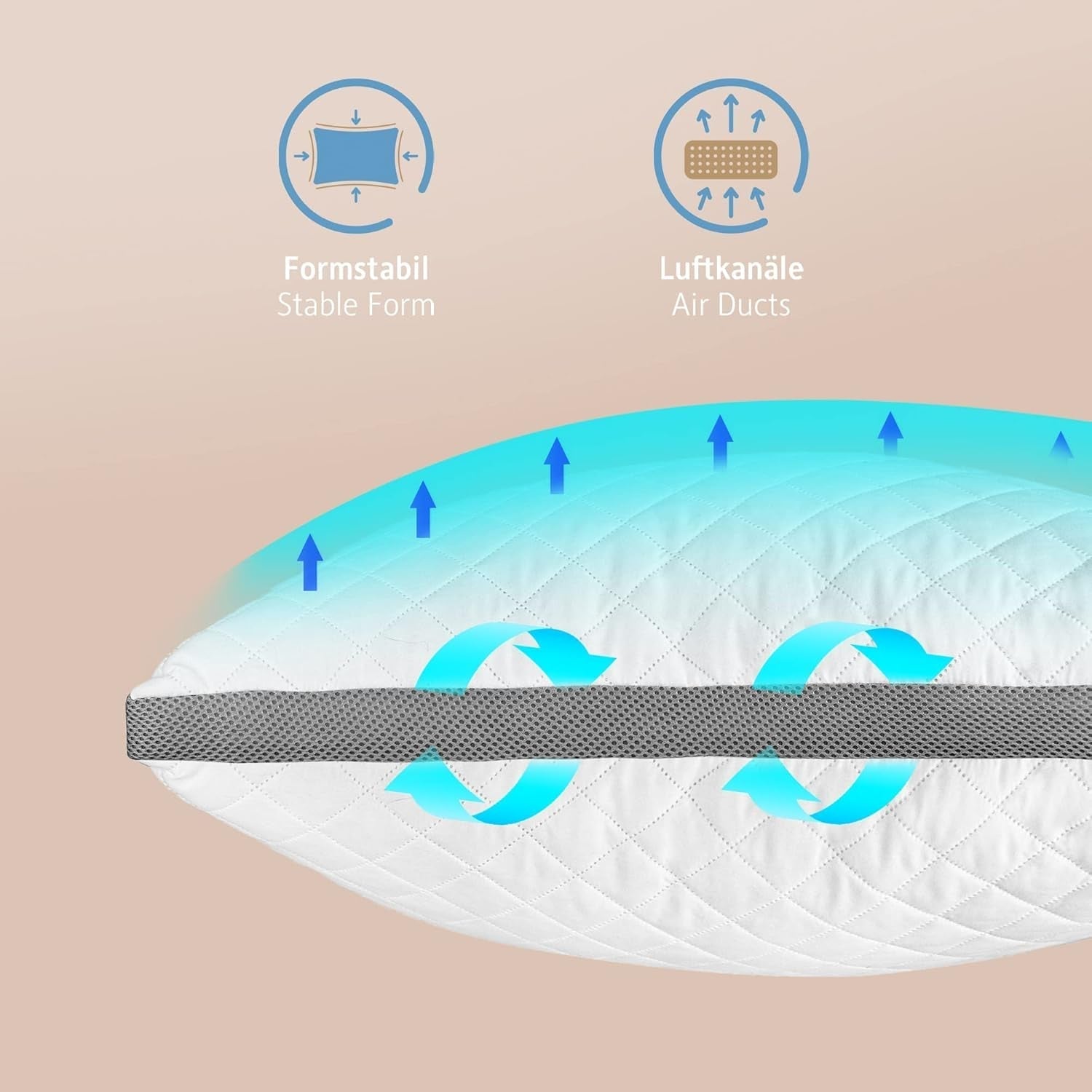 - Wysoka jakość: Oddychające poduszki Komfortec są idealne do każdego stylu spania. Zapewniają doskonałe podparcie szyi i ramion. Poduszka wypełniająca nadaje również fakturze powierzchni przyjemny wygląd. Zachowuje swoją objętość przez wiele lat i zapewnia zdrowy i komfortowy sen. Oddychający materiał: Dzięki super miękkiej, antyalergicznej powłoce z mikrofibry wykonanej w 100% z poliestru, pikowana poduszka zapewnia najbardziej komfortowy sen. Wysokiej jakości materiał wypełniający z perełek z mikrofibry zapewnia wysoki komfort podczas snu i poranka bez bólu szyi i głowy.