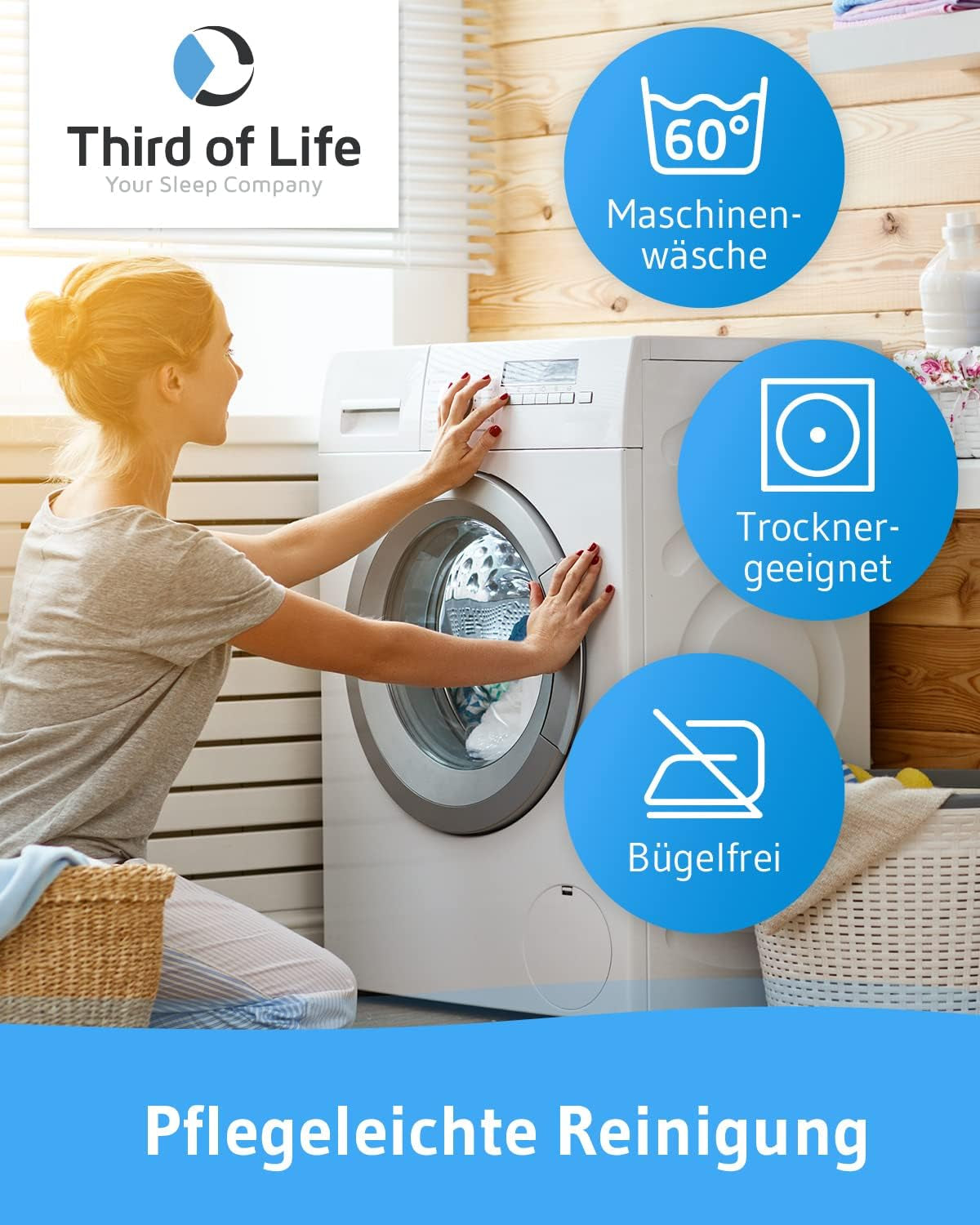 Można prać w pralce w temperaturze 60°, można suszyć w suszarce bębnowej i nie trzeba prasować.