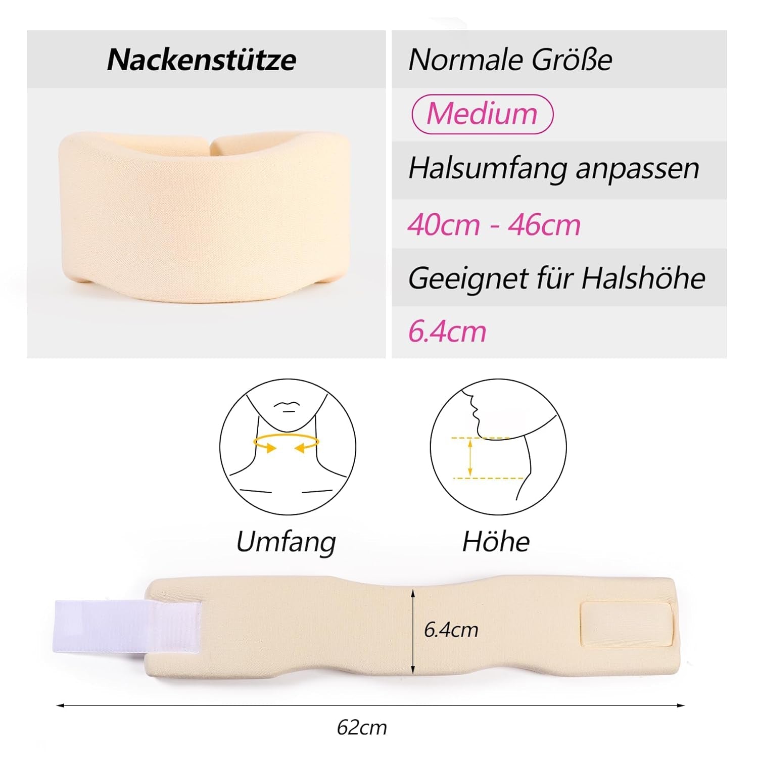 - „Łagodzenie bólu szyi i wsparcie przy urazach” Nasz kołnierz szyjny podtrzymuje szczękę i szyję, ograniczając jednocześnie ruchliwość, aby złagodzić ból i ucisk w kręgosłupie oraz wyrównać i ustabilizować kręgi. Ponadto niesztywny stabilizator szyi łagodzi bóle głowy spowodowane napięciami i skręceniami odcinka szyjnego kręgosłupa. Idealny na bóle szyi, skręcenia i zwichnięcia, bóle mięśni, bóle kręgosłupa oraz do wspomagania urazów szyi. Poduszka podtrzymująca szyję Ergonomicznie ukształtowana poduszka z pluszowej pianki dopasowuje się do szyi i linii szczęki, otula szyję, zapewniając optymalny komfort oraz zapewnia delikatne wsparcie i stabilność głowy i szyi, utrzymując kręgosłup w neutralnej pozycji.