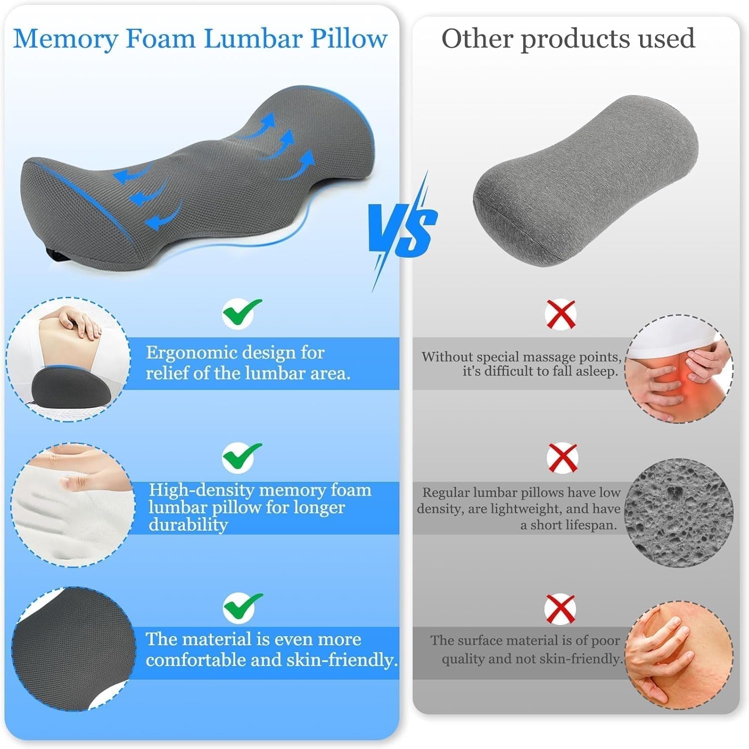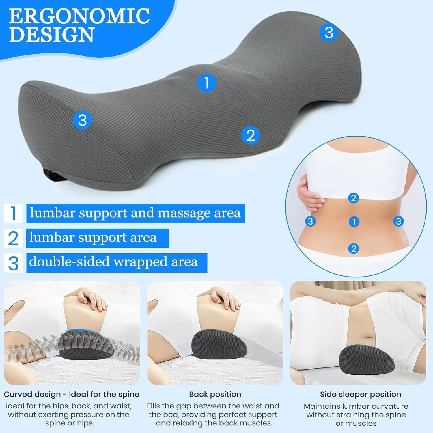 - ðŸŒ'€Ergonomiczna poduszka lędźwiowaã€'Poduszka lędźwiowa jest ergonomicznie zaprojektowana i ma konstrukcję zapewniającą fizyczną przyczepność, która wspiera naturalną krzywiznę odcinka lędźwiowego kręgosłupa. Wypełnia obszar pleców w zagłębieniu kręgosłupa i zapobiega dyskomfortowi podczas długotrwałego leżenia. Zapewnia komfort na całym ciele. ðŸŒ'ã...ã€Wygodny materiał poduszki lędźwiowejã€'Poduszka lędźwiowa jest wykonana z oddychającego, przyjaznego dla skóry materiału i 100% pianki z pamięcią kształtu. Powoli powraca do swojego kształtu w ciągu 5 sekund, zapewniając głęboki i spokojny sen. Osiem punktów masujących pomaga masować odcinek lędźwiowy kręgosłupa. Wymiary: 54,5 x 24 x 11 cm.