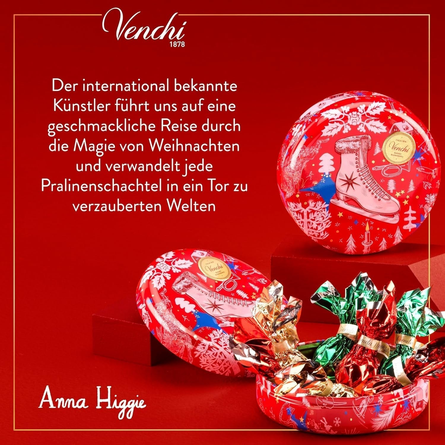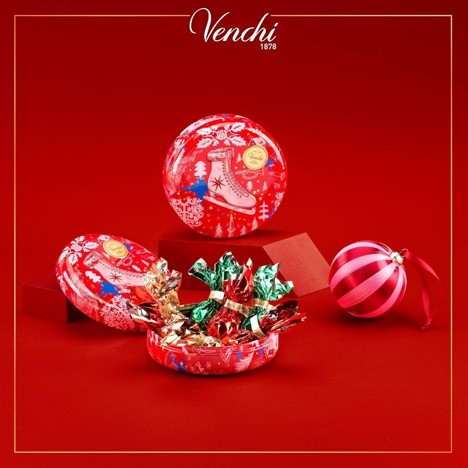 Venchi, Kolekcja Świąteczna - okrągłe pudełko upominkowe z różnymi czekoladkami, 86 gramów
