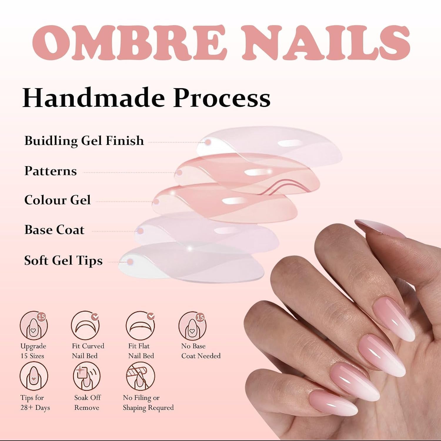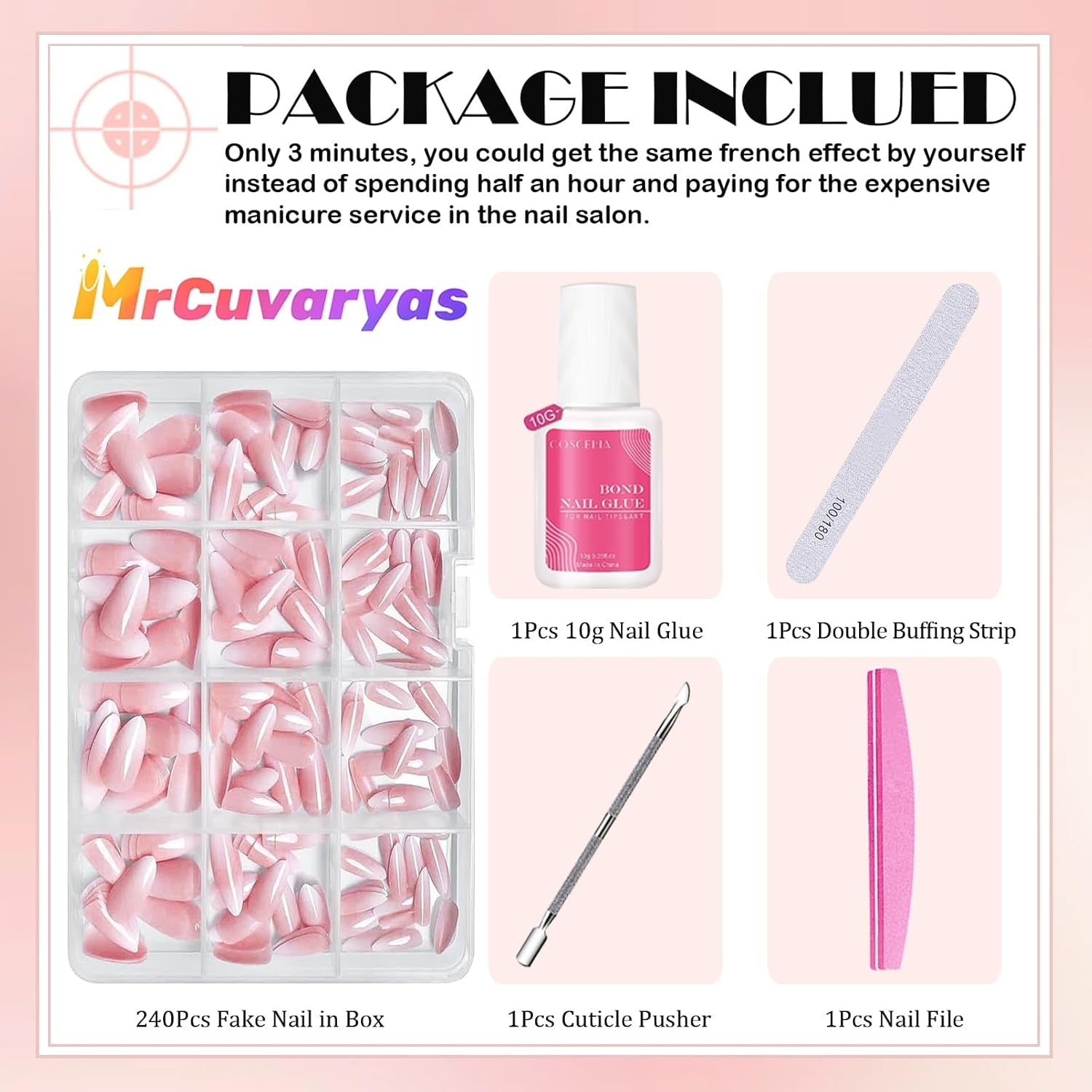 Zestaw do sztucznych paznokci - 240 sztuk Francuskie sztuczne paznokcie Do przyklejenia - różowy biały Gradientowy wzór Sztuczne paznokcie Pełna osłona Miękki żel Naturalny i wygodny w noszeniu (różowy migdał)